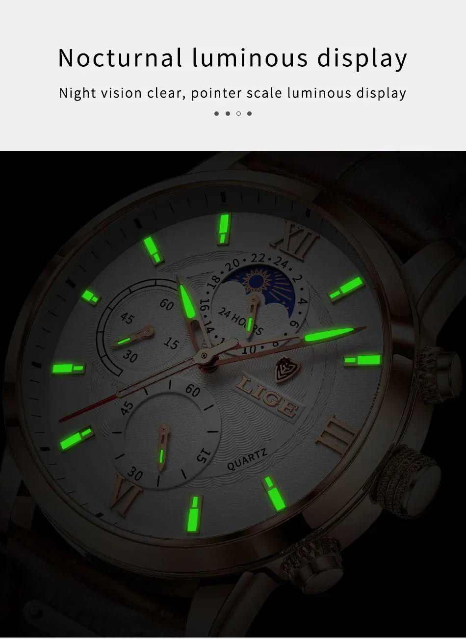 Herren Chronograph – Luxus Quarz-Armbanduhr mit Mondphase & Lederarmband | Sportlich & Elegant | 3ATM Wasserdicht