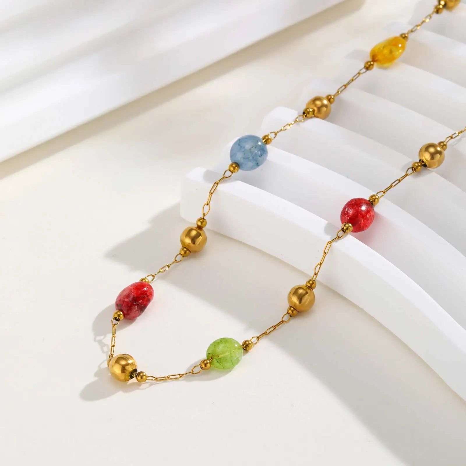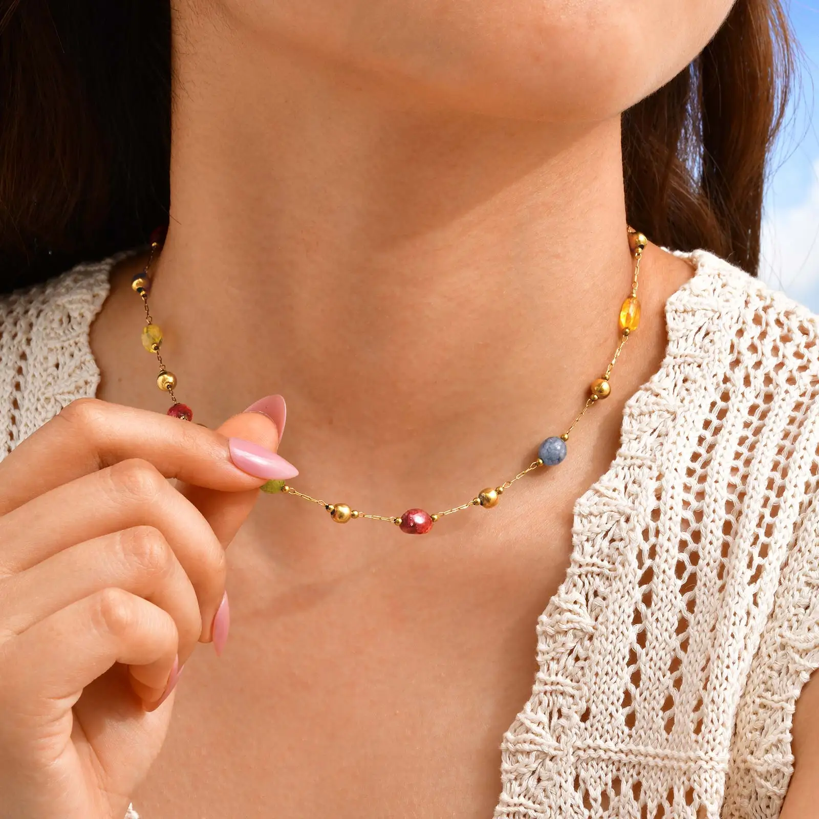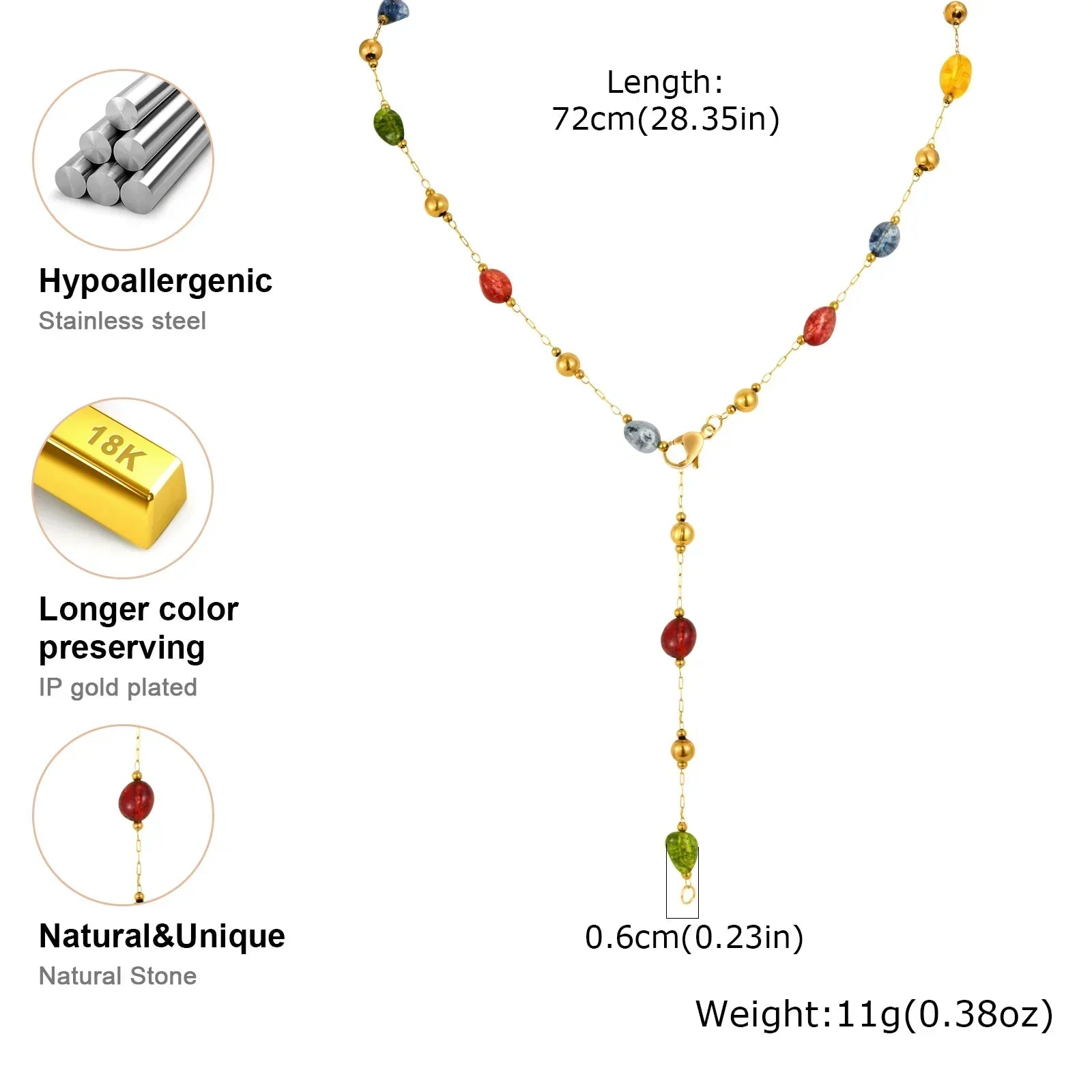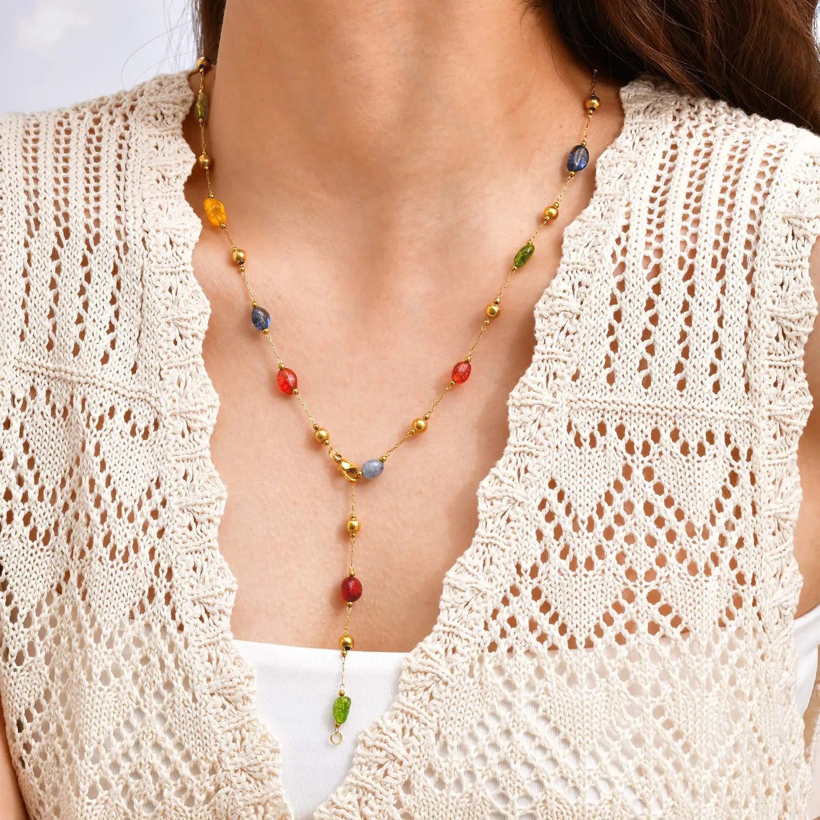 Summer Colorful Rainbow Natural Stone Boho Necklace for Women, Stainless Steel Beaded Chain Y-Shaped Necklace, Fashion Jewelry