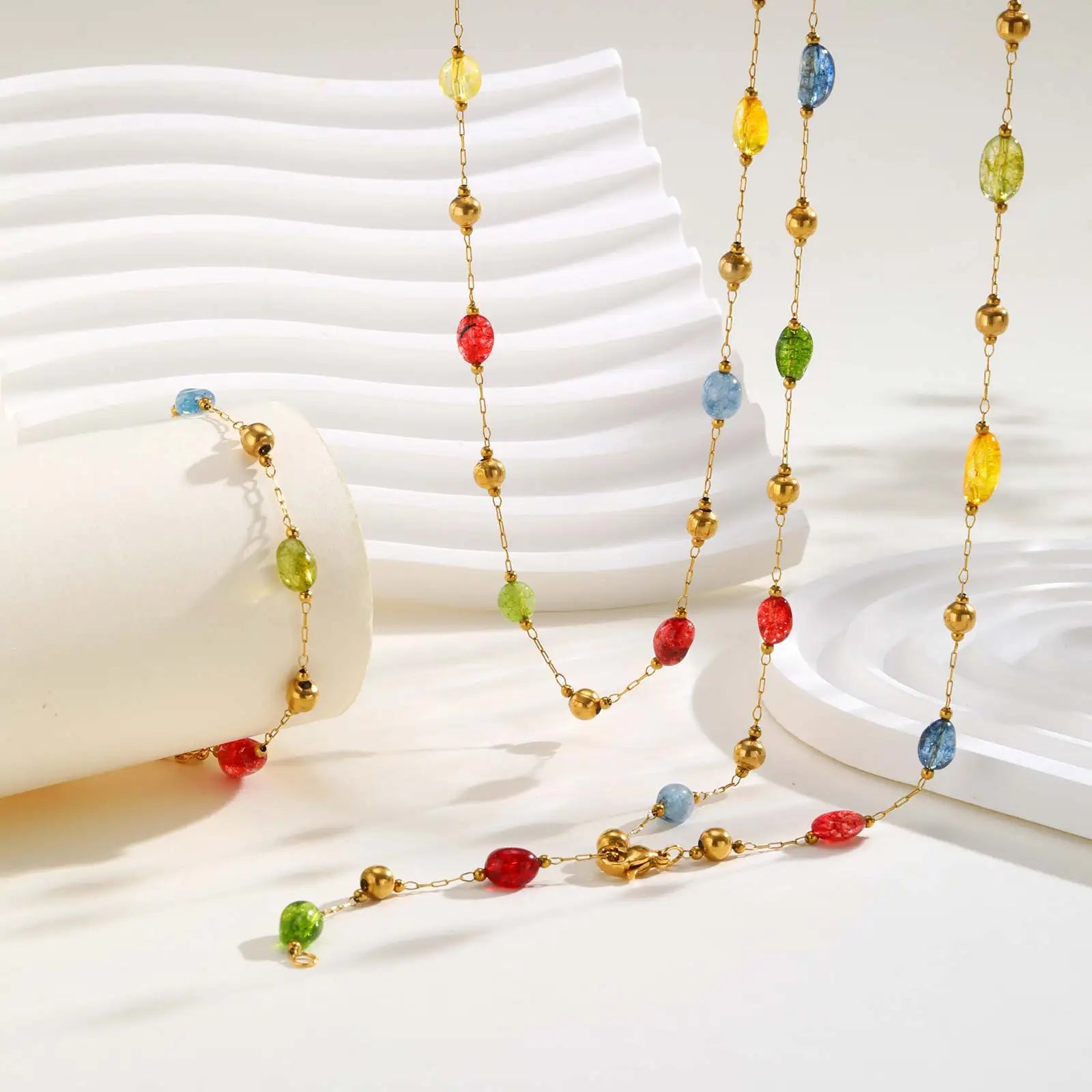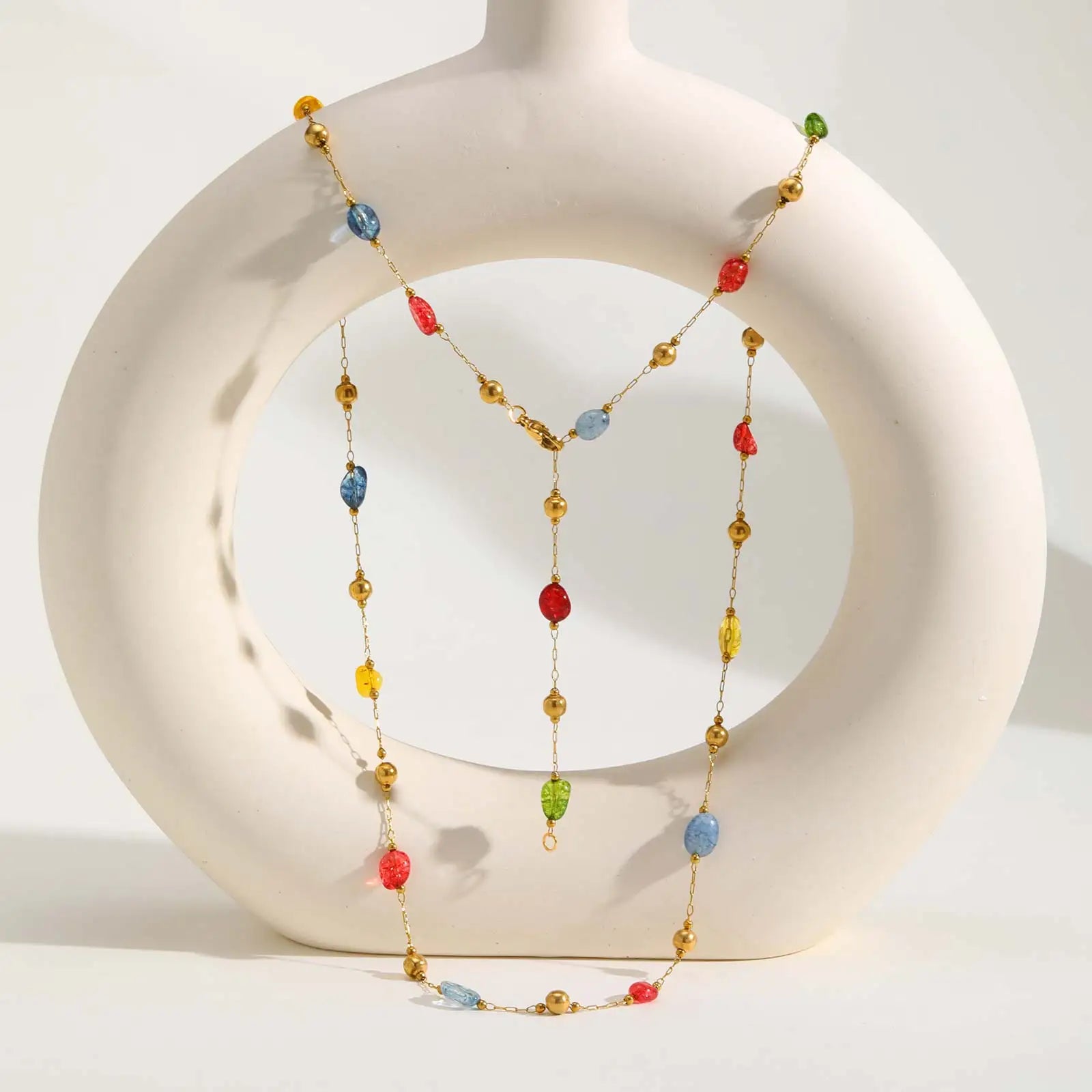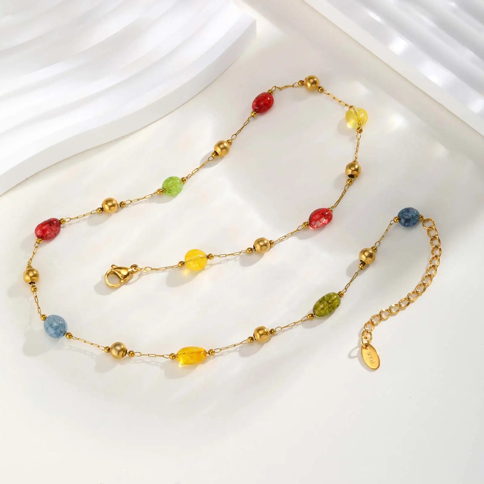 Summer Colorful Rainbow Natural Stone Boho Necklace for Women, Stainless Steel Beaded Chain Y-Shaped Necklace, Fashion Jewelry
