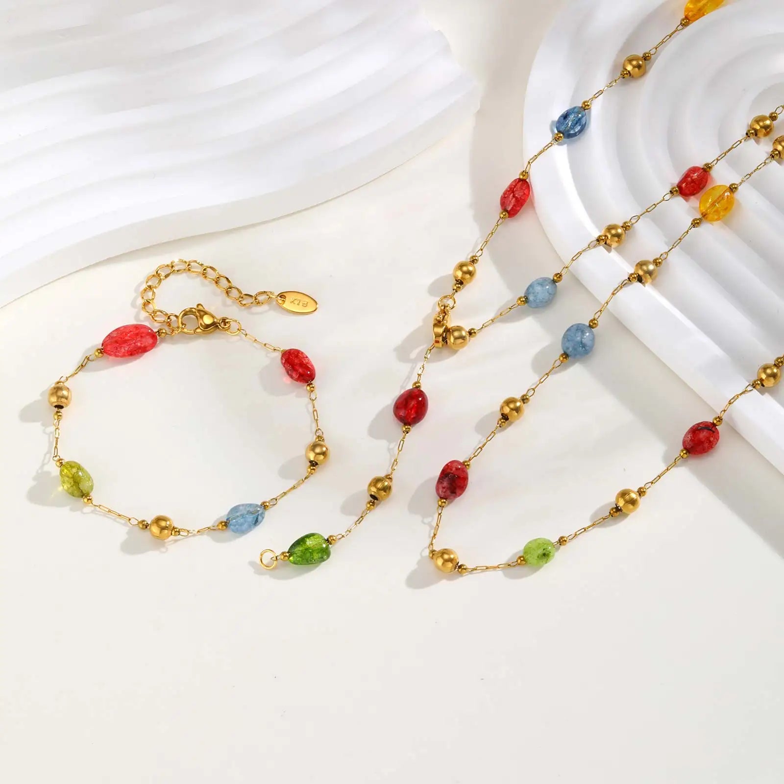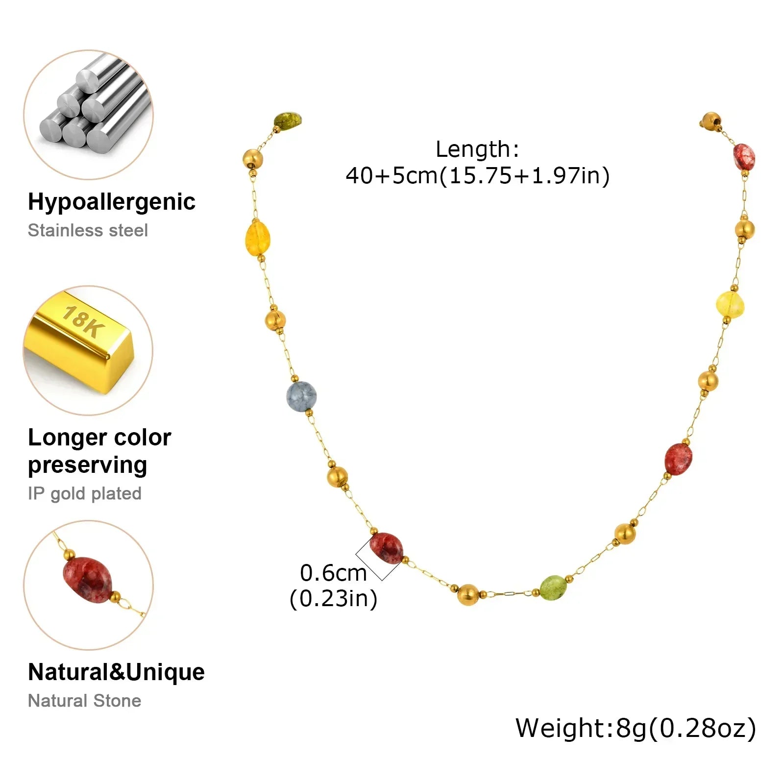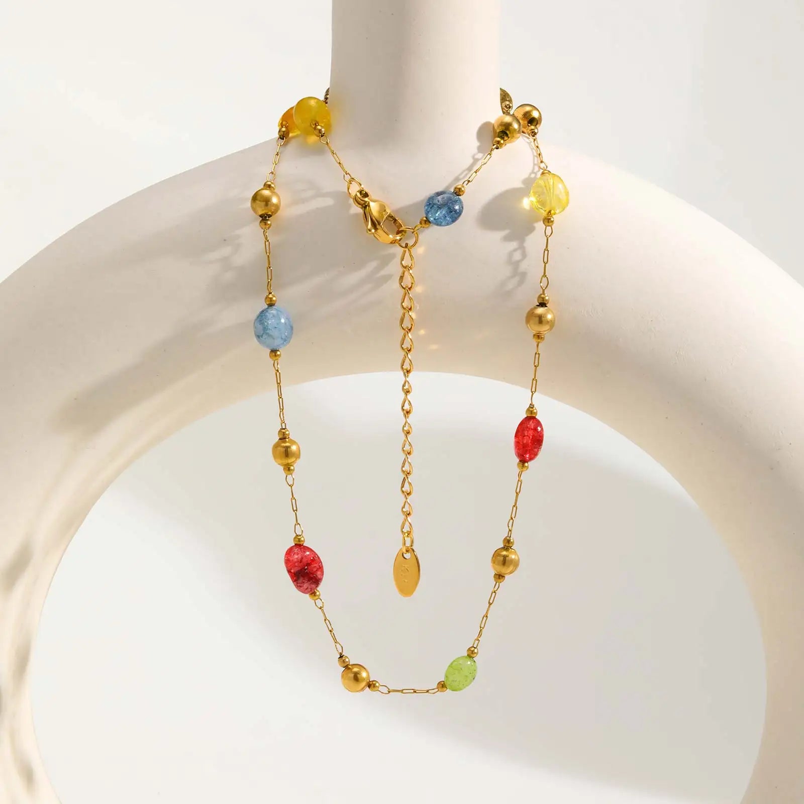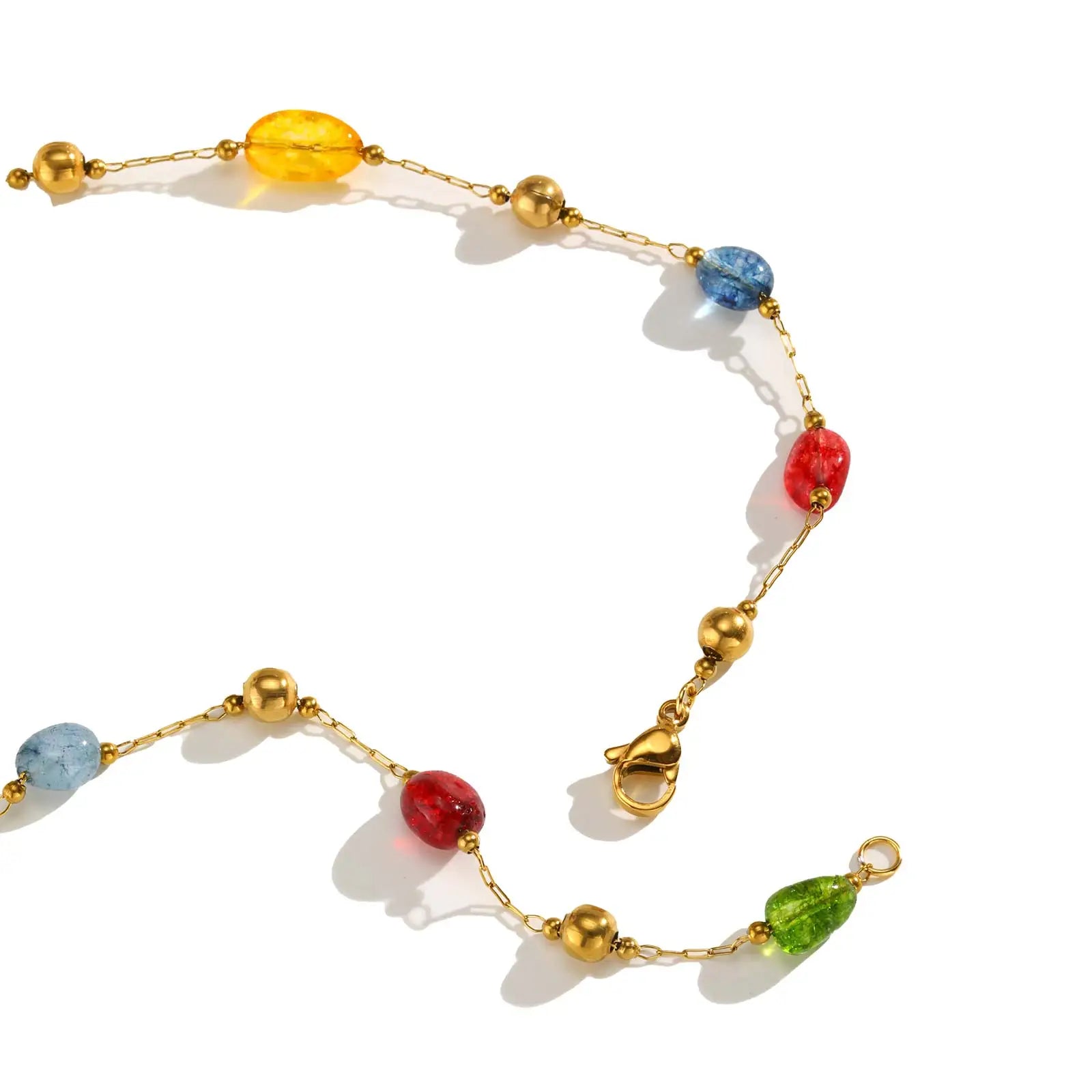 Summer Colorful Rainbow Natural Stone Boho Necklace for Women, Stainless Steel Beaded Chain Y-Shaped Necklace, Fashion Jewelry